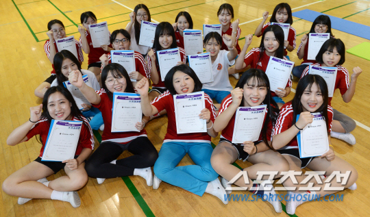 | 안산성호중학교 여학생들이 서로 도와 근력테스트를 하면서 밝게 웃고 있다. 안산=허상욱 기자 wook@sportschosun.com |