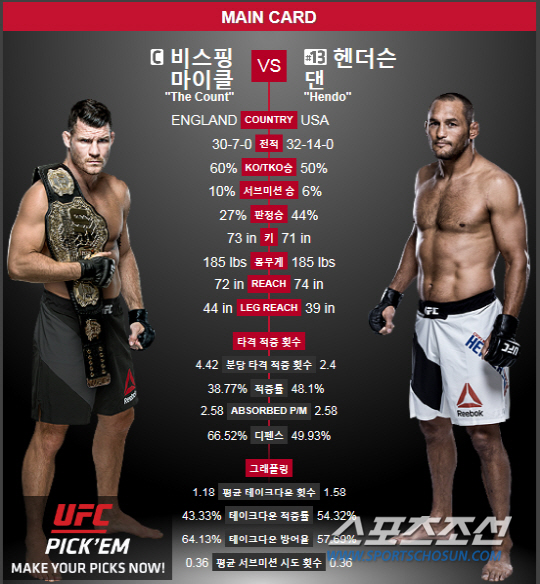 비스핑이 설욕에 성공하며 미들급의 강자로 확인을 받을지, 아니면 헨더슨이 챔피언 벨트를 두르고 은퇴를 하게될지 궁금해진다.
