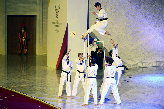 세계태권도연맹(WTF·총재 조정원) 태권도시범단이 5일 바티칸 교황청에서 '인류를 위해 봉사하는 스포츠'라는 주제로 처음 열린 '신앙과 스포츠에 관한 국제 컨퍼런스' 개회식에서 역사적인 태권도 시범공연을 펼쳤다.
