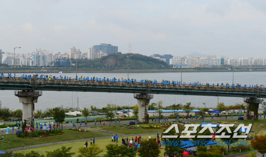 8일 오전 서울 상암동 월드컵공원 잔디광장에서 2016슈퍼블루 마라톤이 펼쳐졌다. 상암 잔디광장을 출발한 참가자들이 코스를 달리고 있다.