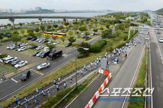 8일 오전 서울 상암동 월드컵공원 잔디광장에서 2016슈퍼블루 마라톤이 펼쳐졌다. 상암 잔디광장을 출발한 참가자들이 한강 시민공원으로 들어서고 있다.