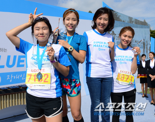 8일 오전 서울 상암동 월드컵공원 잔디광장에서 2016슈퍼블루 마라톤이 펼쳐졌다. 5km 코스 여자부문 입상자들이 나경원 국제장애인올림픽집행위원과 함께 포즈를 취하고 있다.