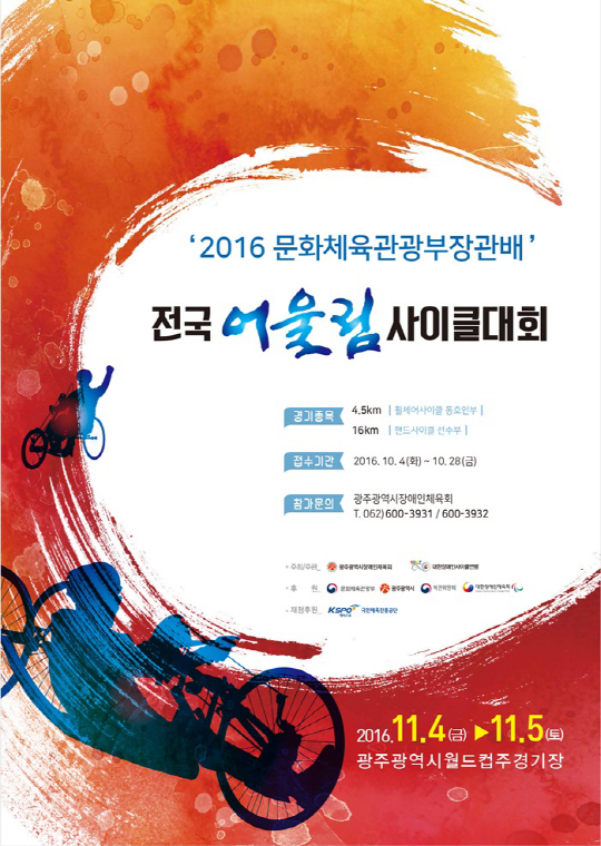 2016년 문화체육관광부장관배 전국어울림사이클대회가 오는 4일과 5일 양일간 광주광역시 월드컵경기장 주변도로에서 개최된다. 이번 대회는 휠체어사이클 동호인부와 핸드사이클 선수부 등 550여명(선수 250명, 운영요원 및 관계자 300명)이 2개 종목에 참가한다. 동호인부는 4.5Km, 선수는 16km 코스에서 경주가 펼쳐지며 남녀로 구분되어 총 4개 이벤트가 열린다.