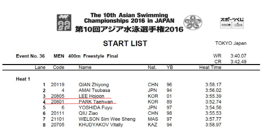 박태환의 남자 자유형 400m 한국최고기록은 2010년 광저우아시안게임에서 기록한 3분41초53, 세계최고기록은 3분40초07(파울 비더만), 아시아최고기록은 3분40초14(쑨양)다.