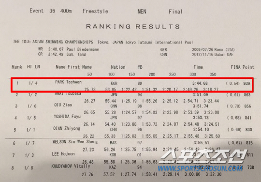 박태환은 18일(이하 한국시각) 일본 도쿄의 다쓰미 국제수영장에서 열린 제10회 아시아수영선수권대회 둘째 날 남자 자유형 400m 결승에서 3분44초68로 가장 먼저 터치패드를 찍었다. 2위 아마이 츠바사(일본·3분51초09)를 압도하는 기량이었다. 이로써 전날 열린 자유형 200m에서 올해 세계랭킹 2위에 해당하는 1분45초16으로 우승을 차지했던 박태환은 이틀 연속 정상에 올랐다.