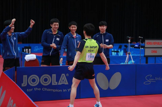 왼손 에이스 조승민이 2점을 잡아내며 제몫을 톡톡히 해냈다. 첫단식에서 유헤위를 3대1(11-8, 11-9, 5-11, 11-8)로 꺾으며 기선을 제압했다. 안재현, 김대우가 쉬하이동과 쉬잉번에게 0대3으로 잇달아 패하며 게임스코어 1대2로 밀린 4단식에서 다시 쉬하이동을 3대1(11-6, 7-11, 11-7, 11-7)로 잡아내며 승부를 원점으로 되돌렸다. 마지막 주자 안재현이 결승행을 완성했다. 유헤위를 3대1(11-9, 2-11, 12-10, 11-8)로 잡으며 환호했다.