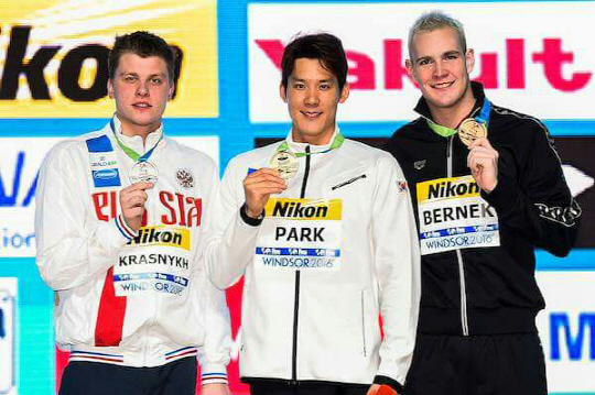 7일 캐나다 윈저 WFCu센터에서 펼쳐진 남자 자유형 400m에서 금메달을 획득한 박태환(가운데)가 2-3위 선수들과 나란히 시상대에서 미소 짓고 있다 . 사진출처=국제수영연맹(FINA)