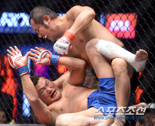 '로드FC 035(XIAOMI ROAD FC 035)'가 10일 장충체육관에서 열렸다. 김보성과 콘도 테츠오의 경기에서 김보성이 경기 중 벌어진 눈 부상으로 경기를 포기하며 패했다. 공격을 시도하는 김보성의 모습. 허상욱 기자 wook@sportschosun.com