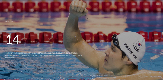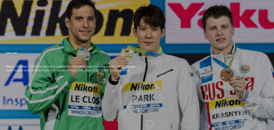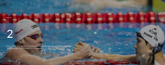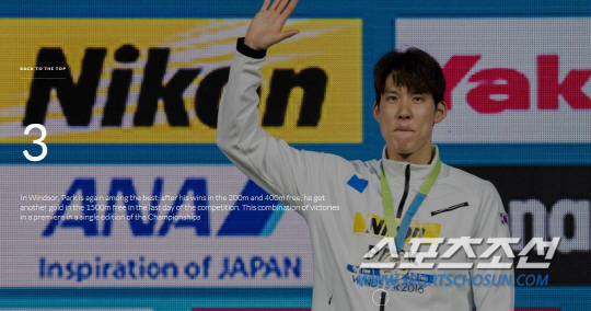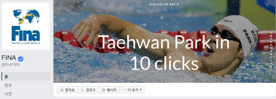 대회 마지막날인 12일 '오늘의 선수'는 3관왕 박태환이었다. 박태환(Taehwan Park)의 이름과 사진이 FINA 홈페이지, 페이스북 등 SNS 메인화면에 떴다. '박태환의 올림픽 참가횟수', '박태환의 메달과 시련', '국민영웅', '오래도록 빠른 선수' 등 '월드클래스' 수영선수 박태환의 모든 것을 짧지만 강렬한 키워드로 소상히 다뤘다. 아래는 FINA가 소개한 '박태환 10클릭' 전문이다.