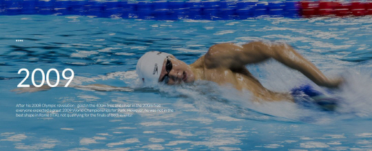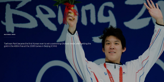 국민영웅: 2008년 베이징올림픽 남자 자유형 400m 금메달리스트인 박태환은 한국 수영사상 올림픽에서 메달을 따낸 최초의 선수다.
