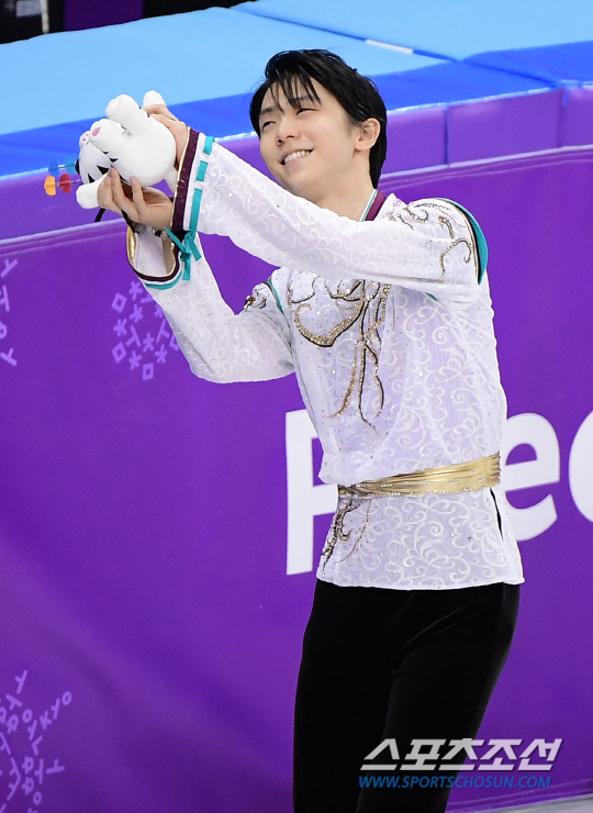 평창 동계올림픽 남자 피겨스케이팅 프리 프로그램 경기가 17일 강릉 아이스아레나에서 열렸다. 일본 하뉴 유즈루가 금메달을 차지했다. 경기장 시상식에서 하뉴 유즈루가 인형을 받아들고 기뻐하고 있다. 강릉=정재근 기자 cjg@sportschosun.com/2018.02.17/