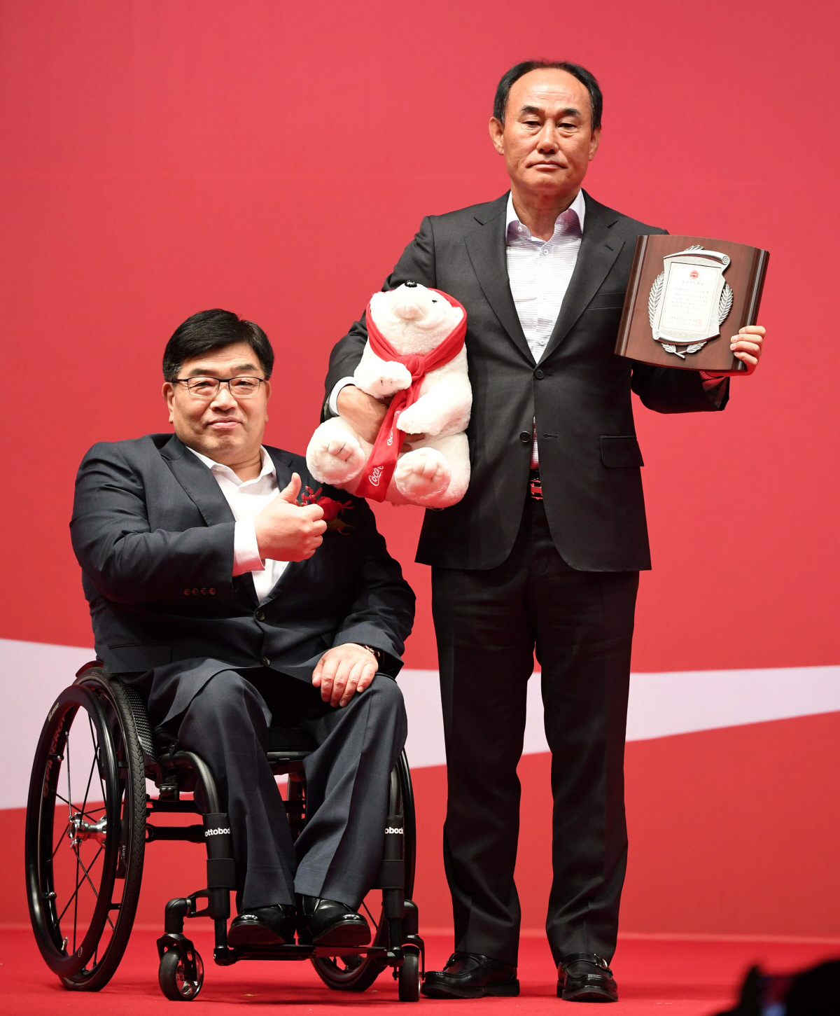 스포츠조선 제정 제24회 코카콜라 체육대상 시상식이 25일 서울 웨스틴조선호텔 그랜드볼룸에서 열렸다. 우수 지도자상 수상자인 김학범 감독이 이명호 대한장애인체육회장으로 부터 상패를 수상하고 있다. 코카콜라 체육대상은 전년도 활약을 토대로, 최우수선수상(MVP), 남녀우수선수상, 우수장애인선수상, 우수단체상, 남녀신인상, 우수지도자상, 특별상을 부문별로 선정, 시상한다. 최우수선수상 수상자에게는 트로피와 상금 1000만원이 주어진다. 소공동= 김경민 기자 kyungmin@sportschosun.com