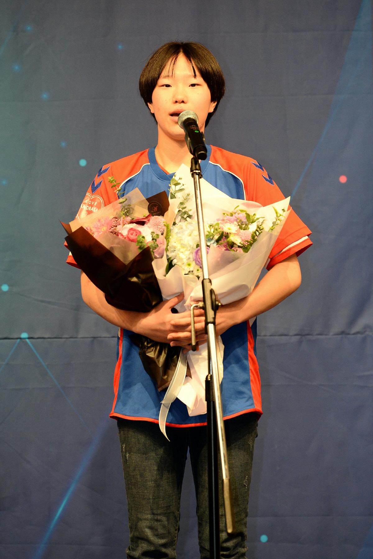 ◇14일 서울 리베라호텔에서 열린 2020 여자 실업핸드볼 신인드래프트에서 전제 1순위로 서울시청에 지명된 황지정보산업고 우빛나가 입단 소감을 발표하고 있다. 사진제공=대한핸드볼협회