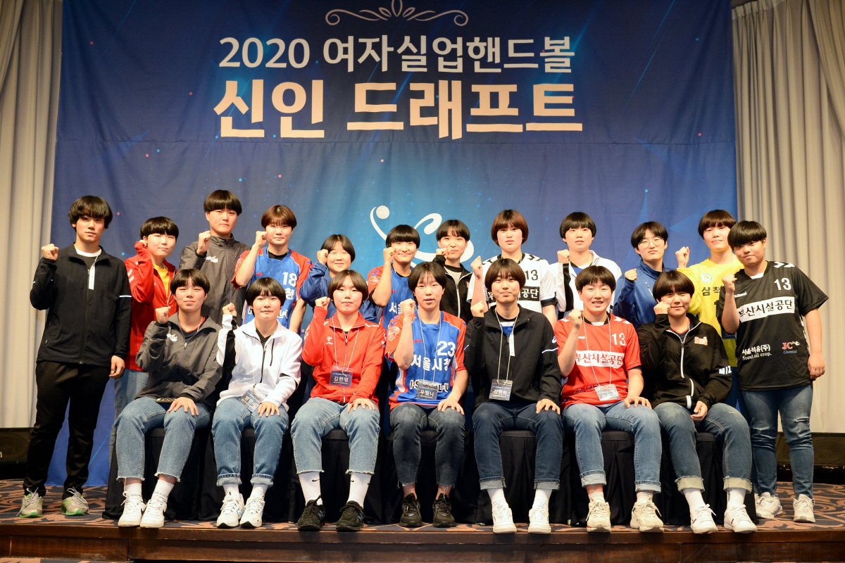 ◇14일 서울 리베라호텔에서 열린 2020 여자 실업핸드볼 신인드래프트에 참가한 19명의 지원자들이 모두 실업팀에 지명됐다 2012년 신인드래프트 제도 도입이후 처음으로 100% 지명이 성사됐다. 신인지명자들이 모두 모여 파이팅을 외치고 있다. 사진제공=대한핸드볼협회