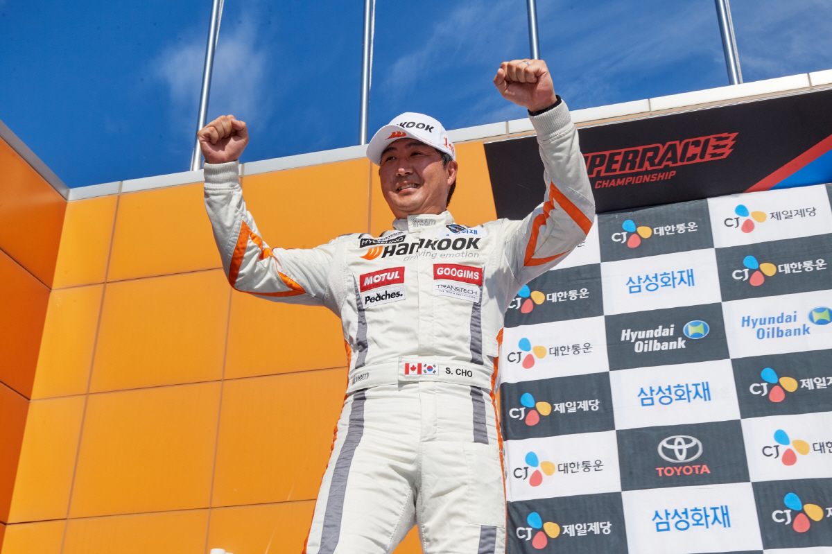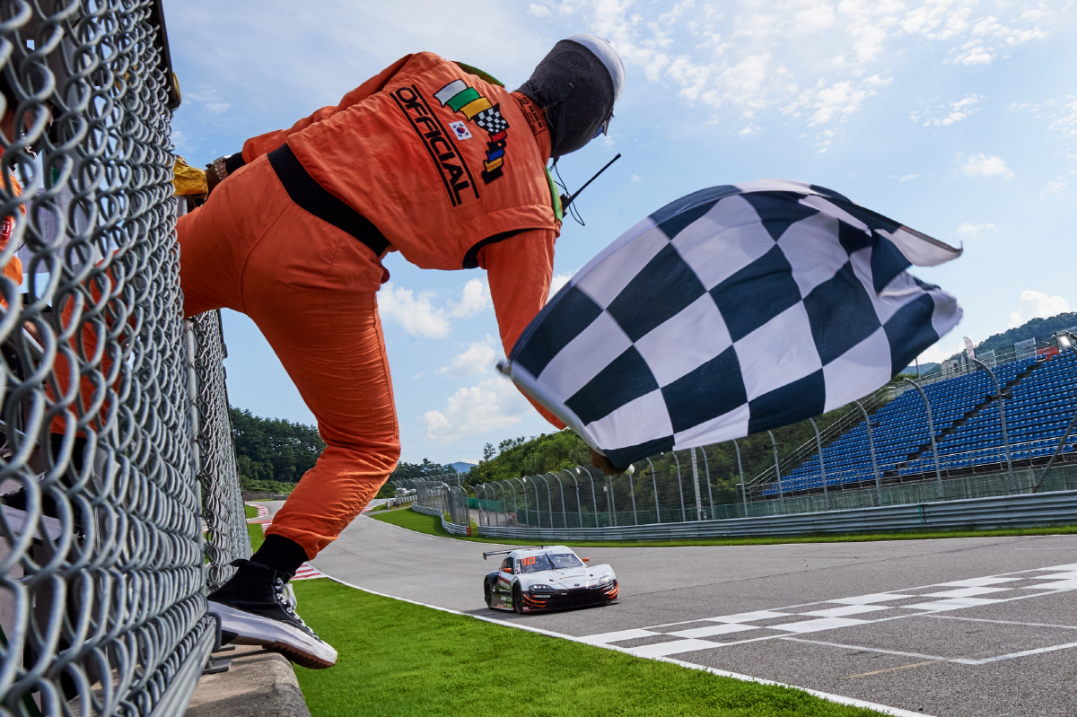 슈퍼레이스 5라운드 삼성화재 6000 클래스 결선에서 가장 먼저 체커기를 받고 있는 조항우. 사진제공=슈퍼레이스