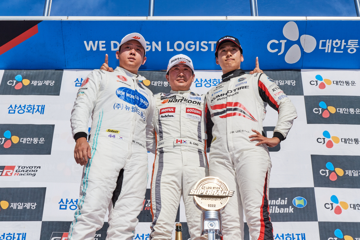 21일 인제스피디움에서 열린 '2022 CJ대한통운 슈퍼레이스 챔피언십' 5라운드 삼성화재 6000 클래스에서 1~3위를 차지한 조항우(가운데)와 김재현(왼쪽) 이정우가 시상대 위에서 포즈를 취하고 있다. 사진제공=슈퍼레이스