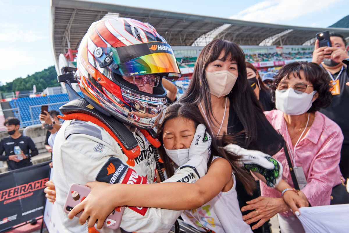 조항우가 가족들과 얼싸안고 우승의 기쁨을 만끽하고 있다. 사진제공=슈퍼레이스