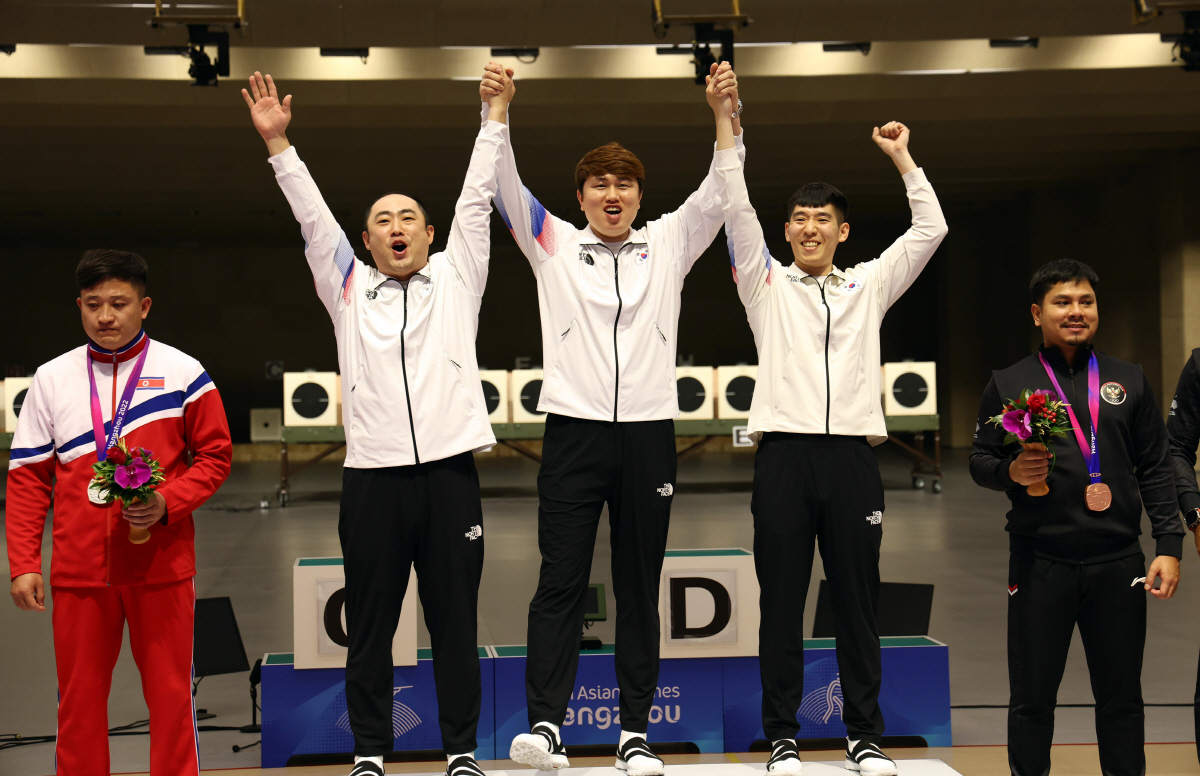 한국 사격 대표팀은 26일 중국 항저우 푸양 인후 스포츠센터에서 열린 항저우아시안게임 사격 남자 10m 러닝타깃 혼합 단체전 금메달을 차지했다.