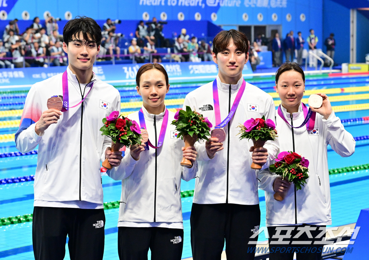 김영범도 '형들'과 한국의 역사를 작성했다. 그는 26일 남자 혼계영 400m 결선에서 3분32초05를 기록했다. 일본을 제치고 은메달을 목에 걸었다. 이들은 지난 7월 30일 일본 후쿠오카에서 열린 세계수영선수권에서 3분34초25의 한국 신기록을 작성한 멤버다. 김영범은 남자 계영 400m에서도 한국의 은메달 획득에 힘을 보탰다.