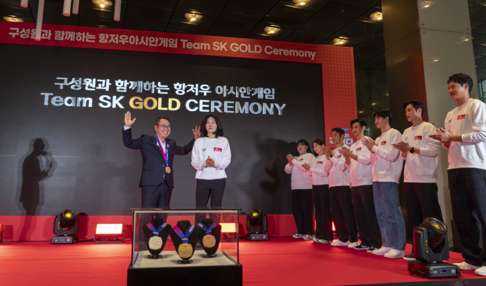 [스포츠조선 노주환 기자]SK텔레콤(대표이사 사장 유영상)이 3일 이번 항저우아시안게임 국가대표로 눈부신 활약을 펼친 자사 후원 선수들을 격려하는 'Team SK Gold Ceremony' 행사를 개최했다. 이날 서울 SKT 을지로 본사 사옥에서 열린 축하행사에는 펜싱 국가대표 김정환 구본길 김준호 오상욱 송세라 최인정, 수영 국가대표 황선우, 역도 국가대표 박혜정이 참석해, 유영상 대표를 비롯한 임직원들과 소통하는 시간을 가졌다. 행사는 각 선수의 활약상이 담긴 영상 상영에 이어 유영상 SK텔레콤 대표의 인사말 및 팬 사인회 등의 순서로 진행됐다. 유 대표는 각자의 종목에서 최선을 다한 Team SK 선수들의 노력에 찬사를 보내고, 메달을 획득한 선수들에게 격려금을 전달했다.