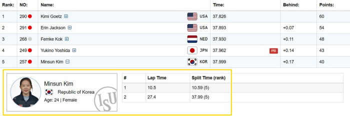 미국 기미 고에츠가 37초826으로 1위, 역시 미국의 에린 잭슨이 37초893으로 2위에 올랐다. 네덜란드 에이스 펨케 코크가 37초930으로 3위를 기록했다. 김민선은 3위에 불과 0.069초 뒤진 5위를 기록했다. 또 김민선과 함께 출전한 국가대표 이나현은 38초472로 11위를 기록했다.