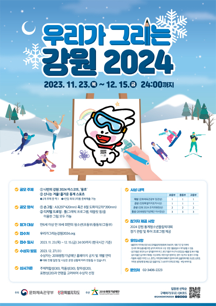 문화체육관광부와 강원특별자치도가 주최하고, 2018평창기념재단이 주관하는 이번 공모전은 만 6세 이상, 19세 미만 청소년을 대상으로 하며,내년 1월 19일부터 2월 1일까지 강원특별자치도에서 열리는 2024 강원 동계청소년올림픽대회의 성공적인 개최를 청소년들과 함께 염원하기 위해 마련됐다.