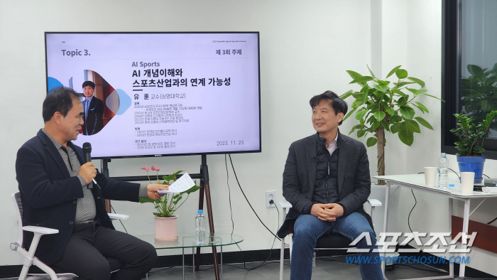 리퍼블릭스포츠가 23일 진행한 스포비즈 콘서트. 유훈 상명대 교수(오른쪽)가 AI와 스포츠의 연계 가능성을 주제로 강연했다. 사진제공=리버블릭 스포츠