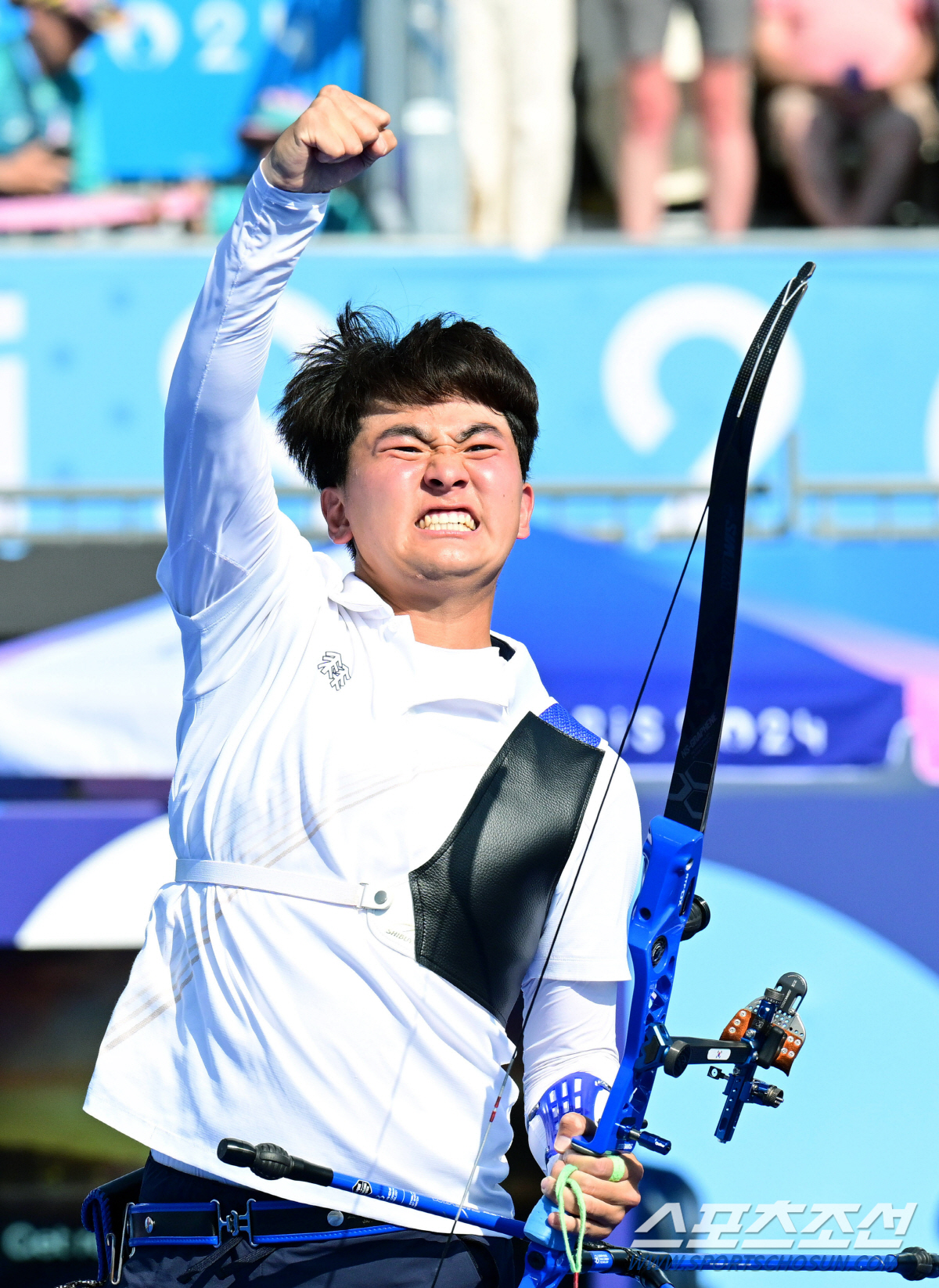 남자 양궁 대표팀의 김제덕이 30일(한국시간) 프랑스 파리 앵발리드에서 열린 2024 파리올림픽 양궁 남자 리커브 단체 결승전에서 프랑스를 꺾고 금메달을 확정한 순간 기뻐하고 있다. 한국 남자 양궁은 올림픽 3연패를 달성했다. 파리(프랑스)=정재근 기자 cjg@sportschosun.com/2024.7.30/