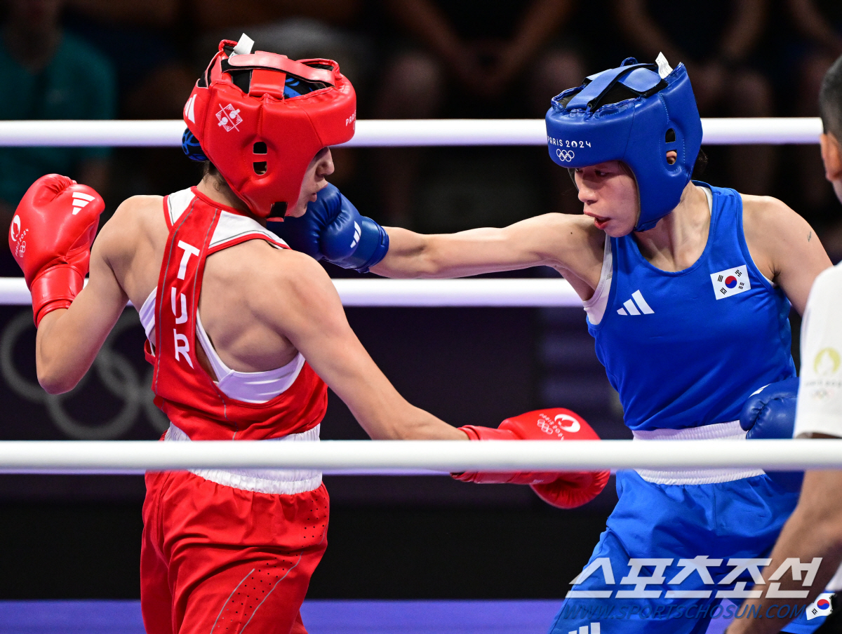 임애지가 4일(한국시각) 프랑스 파리 노스파리 아레나에서 열린 파리올림픽 여자 복싱 54kg급 4강전에서 튀르키예 아크바시와 맞붙어 2대3으로 아쉽게 판정패 했다. 임애지의 훅이 아크바시의 턱을 강타하고 있다. 파리(프랑스)=정재근 기자 cjg@sportschosun.com/2024.8.4/