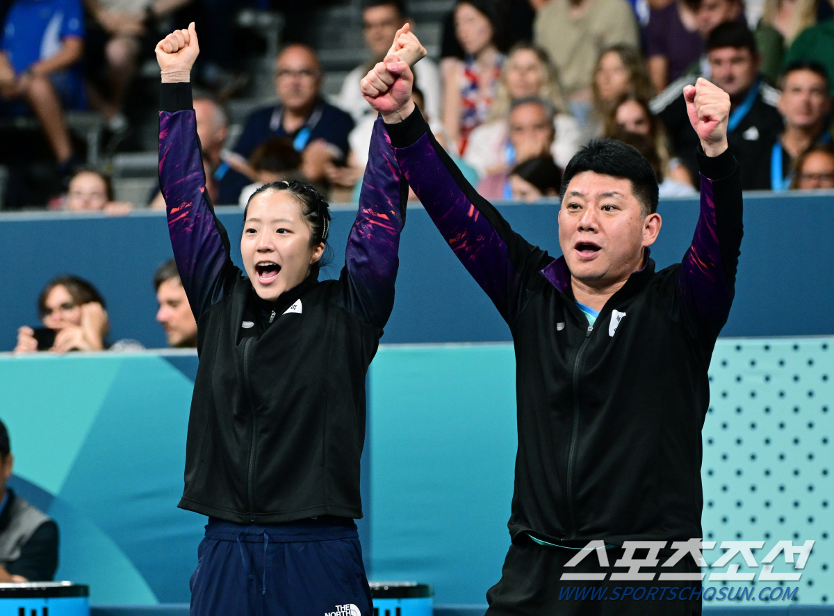대한민국 여자 탁구 대표팀의 신유빈(왼쪽)과 오광헌 감독이 6일(한국 시간) 프랑스 파리 사우스 파리스 아레나4에서 열린 2024 파리올림픽 탁구 여자 단체 16강전에서 단식에 나선 이은혜의 득점에 기뻐하고 있다. 파리(프랑스)=정재근 기자 cjg@sportschosun.com/2024.8.6/