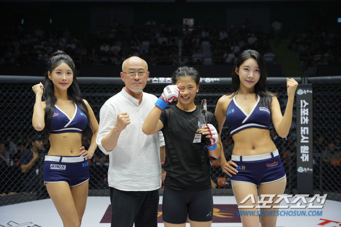 굽네치킨 중국지사 김영철 대표가 31일 원주종합체육관에서 열린 굽네 ROAD FC 069 스트로급 매치에서 승리한 이보미에게 트로피를 시상한 뒤 기념촬영을 하고 있다. 사진제공=로드FC