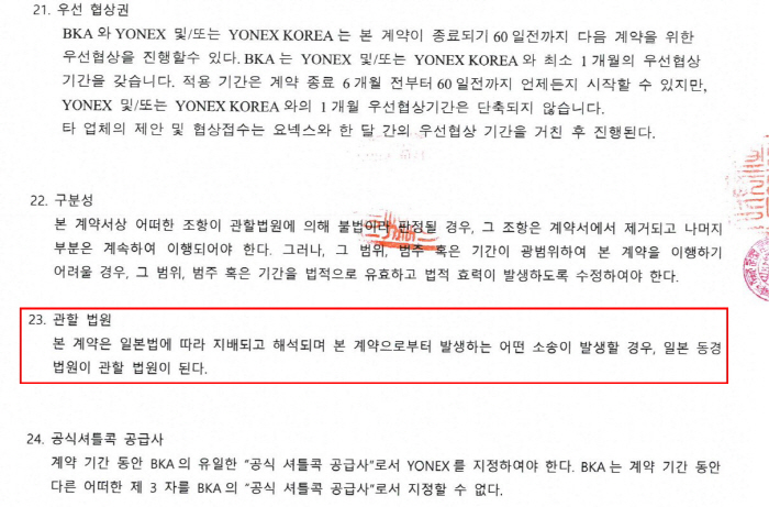 배드민턴협회와 요넥스의 계약서 중 분쟁 발생 관련 조항.