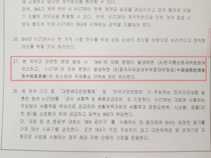 배드민턴협회-빅터의 2017년 계약서. 분쟁 발생 시 각국 관할 당국을 통해 법적 절차를 밟기로 한다는 규정을 정하고 있다.