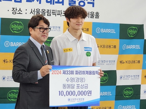 (서울=연합뉴스) 하남직 기자 = 2024 파리 올림픽 수영 남자 자유형 400m에서 동메달을 딴 김우민(23·강원도청)이 대한수영연맹으로부터 포상금 1천만원을 받았다.