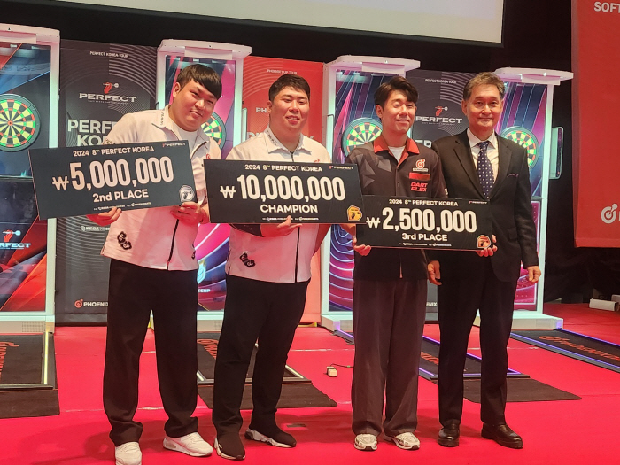 퍼펙트코리아 8차대회 입상자들이 시상대에서 환하게 웃고 있다. 왼쪽부터 한영주(2위) 김용석(1위) 이세현(3위). 맨 끝은 시상을 맡은 방준식 회장 (사진제공=대한소프트다트협회)