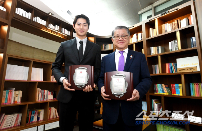 '파리올림픽 개인-단체 2관왕' 오상욱(왼쪽)과 최신원 대한펜싱협회장.