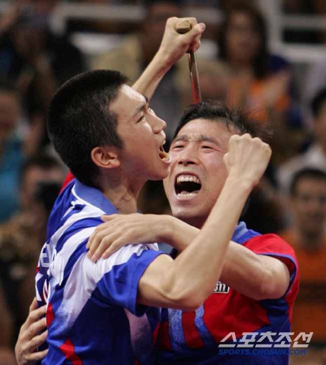 2004년 아테네올림픽 남자탁구 단식 결승에서 세계 최강 중국의 왕하오를 꺾고 금메달을 확정지은 순간. 김택수 남자대표팀 감독과 환호하는 모습. 스포츠조선DB