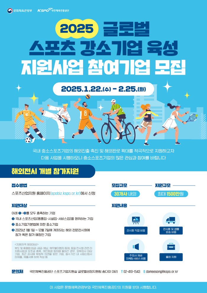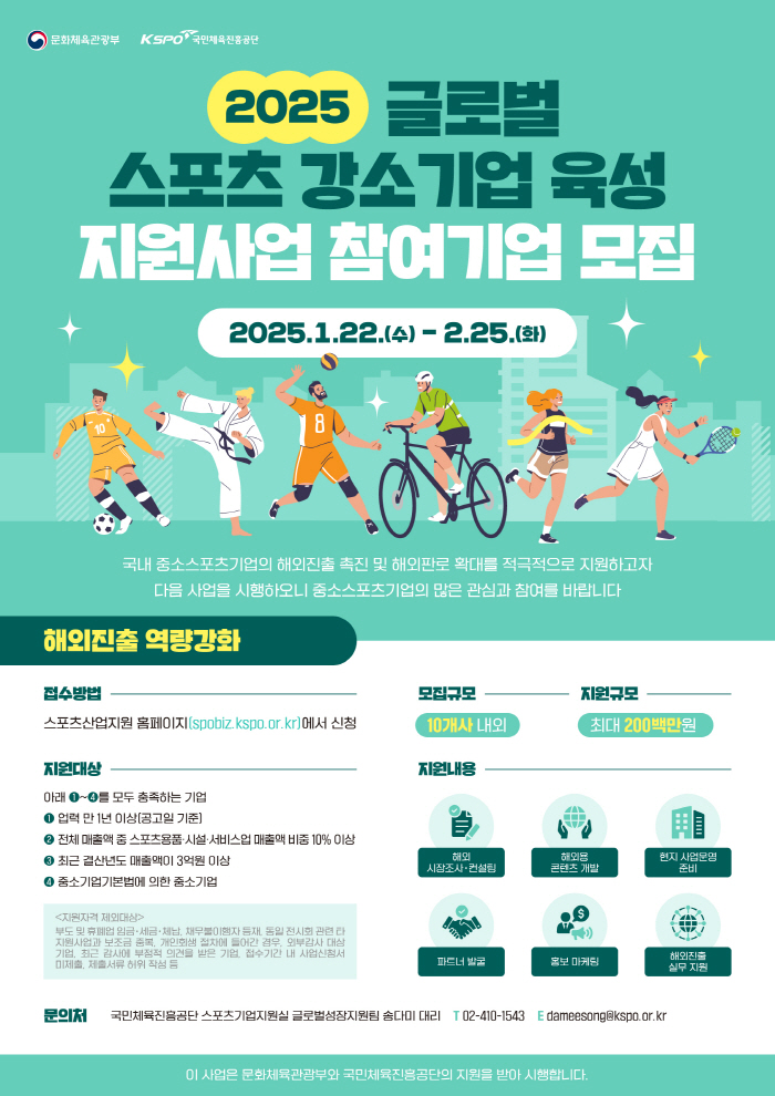 [스포츠조선 윤진만 기자]서울올림픽기념국민체육진흥공단(이사장 하형주, 이하 체육공단)은 문화체육관광부(장관 유인촌)와 함께 '2025년도 글로벌 스포츠 강소기업 육성 지원사업'에 참여할 기업을 모집한다고 밝혔다.