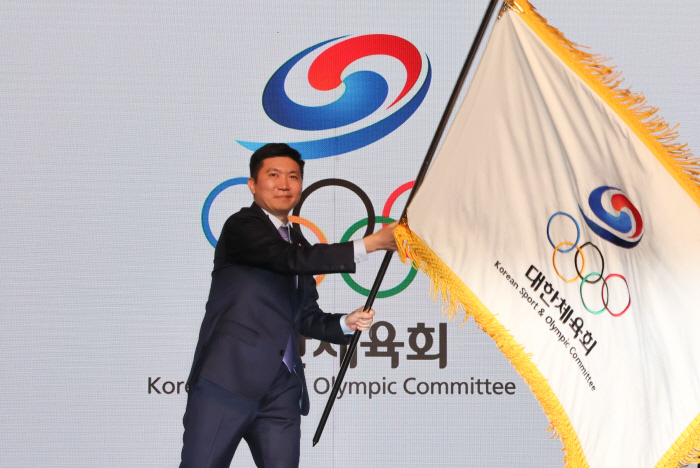 대한체육회기 흔드는 유승민 대한체육회장<저작권자(c) 연합뉴스, 무단 전재-재배포, AI 학습 및 활용 금지>