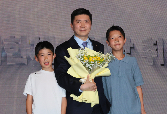 유승민 대한체육회장이 27일 서울 용산구 그랜드 하얏트 호텔에서 열린 제42대 대한체육회장 취임식에서 두 아들에게 꽃다발을 받은 뒤 포즈를 취하고 있다. <저작권자(c) 연합뉴스, 무단 전재-재배포, AI 학습 및 활용 금지>