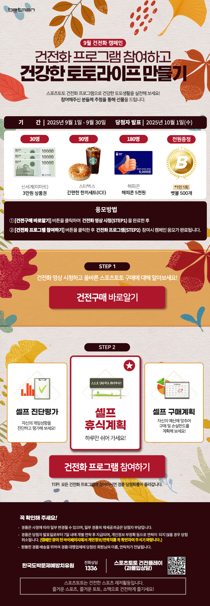 서울올림픽기념국민체육진흥공단이 발행하는 체육진흥투표권 스포츠토토의 공식 인터넷 발매사이트 베트맨이 2025년 9월 건전화 캠페인인 '건전화 프로그램 참여하고 건강한 토토라이프 만들기' 이벤트를 오는 30일까지 진행한다고 밝혔다.