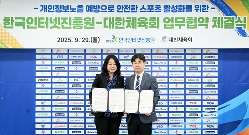 29일 진행된 협약식에는 김나미 대한체육회 사무총장과 황보성 한국인터넷진흥원 개인정보안전활용본부장 등 관계자들이 참석했다.