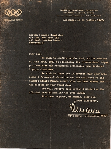 전시장에는 국가등록문화유산인 이원순 여행 증명서를 비롯해 IOC 가입 승인서, 김윤만 본부장의 메달과 시상복 등의 유물이 전시된다.