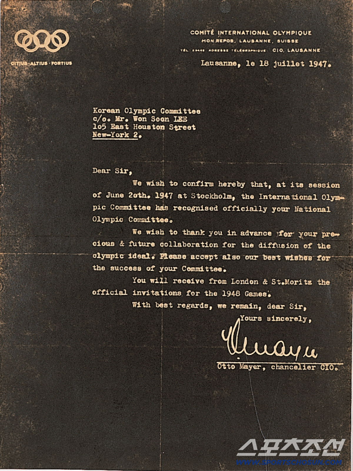 해방 직후 혼란스러운 정국 속에서도 체육계는 조선체육회(대한체육회의 전신)를 재건하고 올림픽 참가를 위해 조선올림픽위원회(KOC)를 설립, IOC 가입을 추진했다. 1947년 스웨덴 스톡홀름에서 열린 IOC 제40차 총회에 대한민국 대표로 참석 예정이었던 전경무가 비행기 추락사고로 사망하면서, 당시 미국에 거주하던 이원순이 대신 참석했다. 이원순은 KOC라는 조직에 대한 상세한 연대기적 설명과 아마추어 정신에 기반한 운영 원칙, IOC 헌장 준수 의지 등에 대해 연설했고, 그 결과 1947년 6월 20일 열린 총회에서 IOC위원들의 만장일치로 KOC는 가입을 인준 받게 된다.