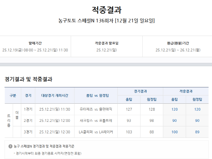 한편, NBA 3경기를 대상으로 한 농구토토 스페셜N 140회차는 25일 오전8시부터 27일 오전10시까지 발매를 진행한다.