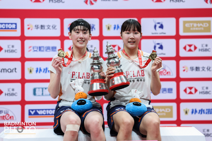 (251221) -- HANGZHOU, Dec. 21, 2025 (Xinhua) -- Baek Ha Na/Lee So Hee (front) of South Korea celebrate after winning the women's doubles final between Baek Ha Na/Lee So Hee of South Korea and Fukushima Yuki/Matsumoto Mayu of Japan at BWF World Tour Finals 2025 in Hangzhou, east China's Zhejiang Province, Dec. 21, 2025. (Xinhua/Jiang Han)<저작권자(c) 연합뉴스, 무단 전재-재배포, AI 학습 및 활용 금지>