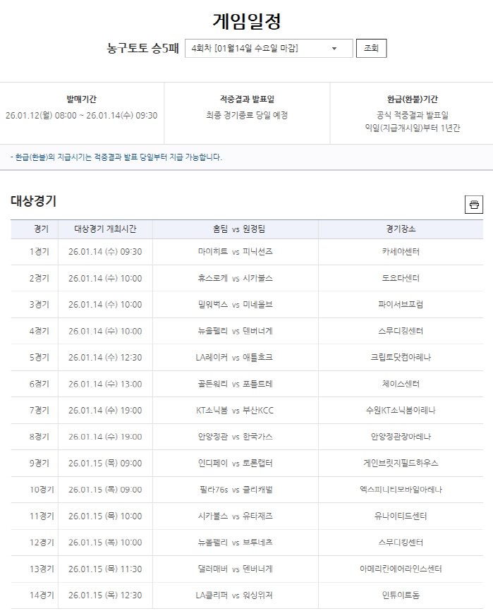한편, 현재 발매 중인 농구토토 승5패 4회차에는 마이애미 히트-피닉스 선즈, 밀워키 벅스-미네소타 팀버울브스, LA 레이커스-애틀랜타 호크스, 골든스테이트워리어스-포틀랜드 트레일블레이저스 등 NBA 주요 경기와 함께 KT 소닉붐-부산 KCC, 안양 정관장-한국가스공사 등 KBL 핵심 매치업이 포함돼 있다.