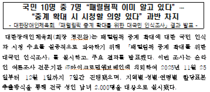 [스포츠조선 전영지 기자대한장애인체육회가 3월 밀라노-코르티나동계패럴림픽을 앞두고 '패럴림픽 중계 확대를 위한 대국민 인식조사'를 실시하고, 결과를 발표했다.
