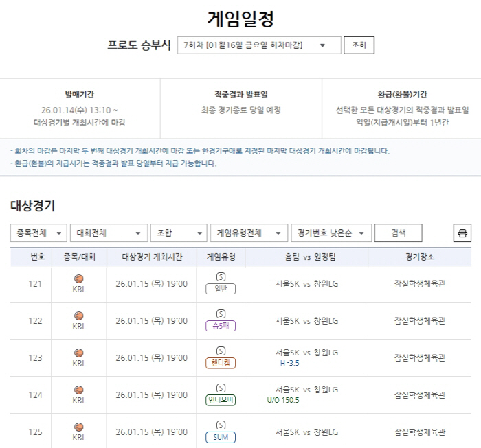서울올림픽기념국민체육진흥공단이 발행하는 체육진흥투표권 스포츠토토의수탁사업자 한국스포츠레저㈜가 오는 15일 오후 7시에 잠실학생체육관에서 열리는 2025~2026시즌 KBL 서울SK(홈)-창원LG(원정)전을 대상으로 한 프로토 승부식 7회차가 발매 마감을 앞두고 있다고 밝혔다.
