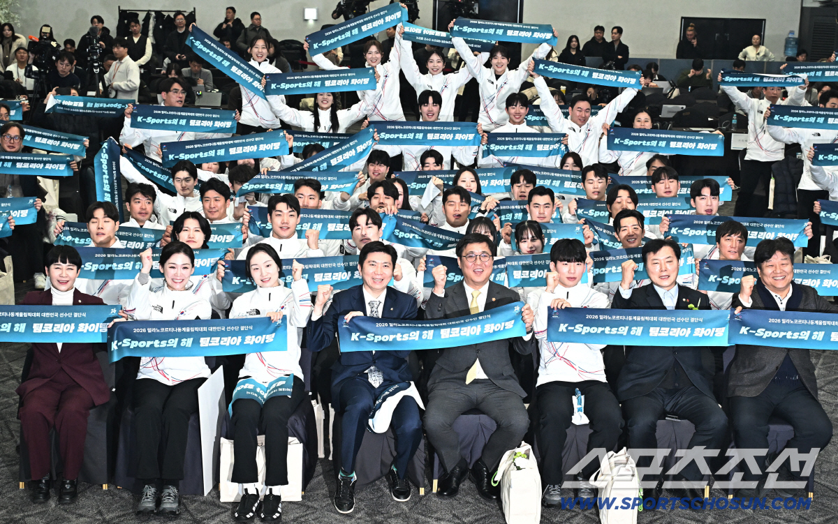 22일 잠실 올림픽파크텔에서 '2026밀라노코르티나 동계올림픽' 출전 대한민국 선수단 결단식이 열렸다. 단체 기념촬영을 하고 있는 대한체육회 유승민 회장과 문화체육관광부 최휘영 장관과 선수단. 잠실=송정헌 기자songs@sportschosun.com